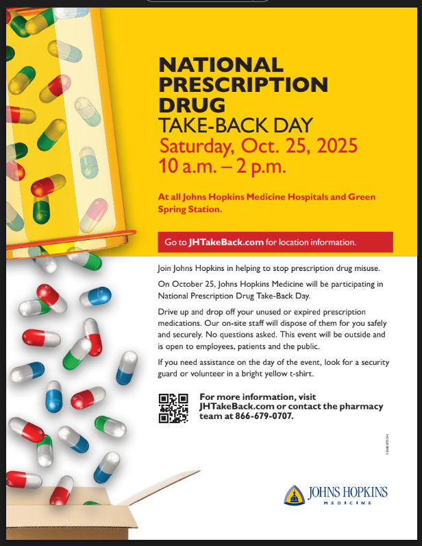 Join Johns Hopkins in helping to stop prescription drug misuse. On October 25, Johns Hopkins Medicine will be participating in National Prescription Drug Take-Back Day. Drive up and drop off your unused or expired prescription medications. Our on-site staff will dispose of them for you safely and securely. No questions asked. This event will be outside and is open to employees, patients and the public.
