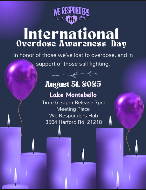 On Sunday, August 31, 2025, We Responders Inc. invites you to join us at Lake Montebello for International Overdose Awareness Day as we come together to honor the lives lost to overdose and stand in support of those still fighting. Beginning at 6:30 PM, we will gather at the We Responders Hub (3504 Harford Rd, Baltimore, MD 21218) before moving to the lake for a candlelight vigil and a 7:00 PM balloon release—symbols of love, healing, and remembrance. This evening will be a space for reflection, connection, and unity as we raise awareness and spread hope throughout our community. If you are unable to attend in person, we invite you to light a candle or release a purple balloon wherever you are and share your photo with We Responders Inc., joining us from near or far in lifting light and love for every life touched by overdose.