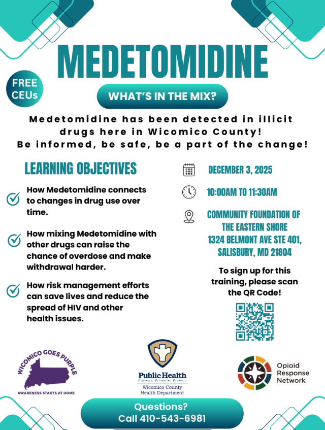 Medetomidine is a veterinary anesthetic used to sedate animals, and it has recently been found in the illicit drug supply here in Wicomico County. This training will provide important information about this emerging public health concern and how we can work together to raise awareness and protect our community!